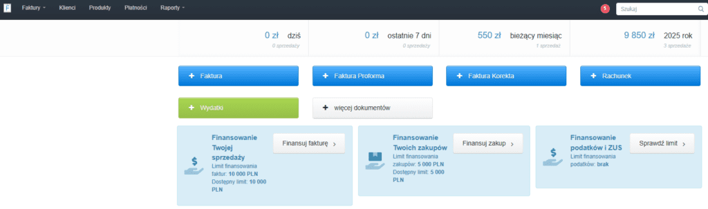 Faktura.pl jest jednym z najstarszych programów do faktur w Polsce. Interfejs jest bardzo prosty w obsłudze, a fakturowanie szybkie i z integracją KSeF. Dzięki współpracy z firmą Finea, z poziomu Faktura.pl mamy możliwość finansowania faktur do kwoty 100.000 zł. Warto przetestować program przez pierwsze 30 dni za darmo.
