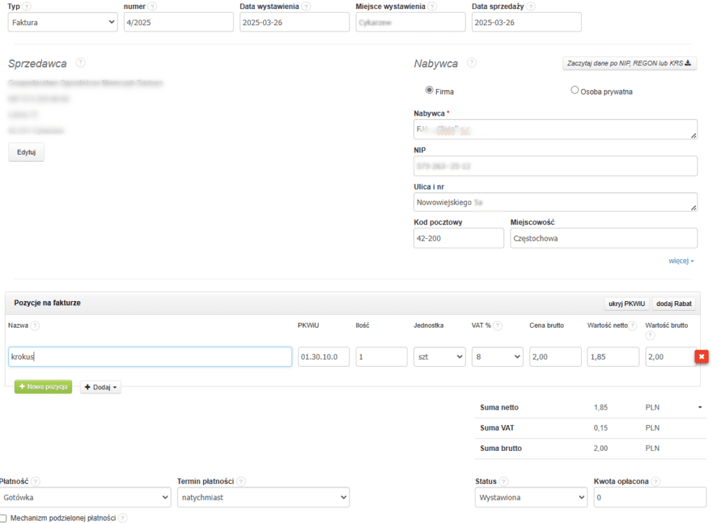 3. Otworzy ci się okno tworzenia faktury. Dane, takie jak numer faktury, data wystawienia, miejsce wystawienia, data sprzedaży, oraz sprzedawca powinny uzupełnić się automatycznie.