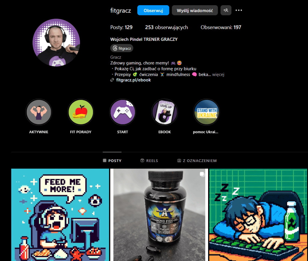 Poniżej przykład profilu na Instagramie, który wykorzystuje 1koszyk do sprzedaży swojego e-booka. Umieścił on link do swojej strony, a następnie na jego stronie możemy zakupić produkt właśnie za pomocą 1koszyk.