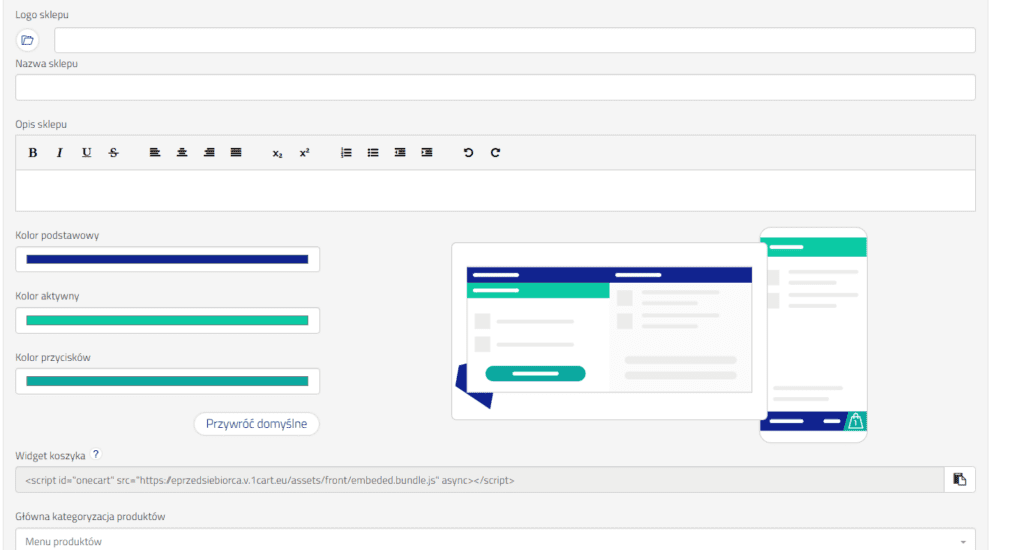 1koszyk daje nam również pewną opcję manewru, jeśli chodzi o wygląd naszego sklepu. Domyślnie ustawione są kolory firmy 1koszyk, jednak możemy dostosować je do własnych potrzeb i kolorystki naszej firmy lub produktu.