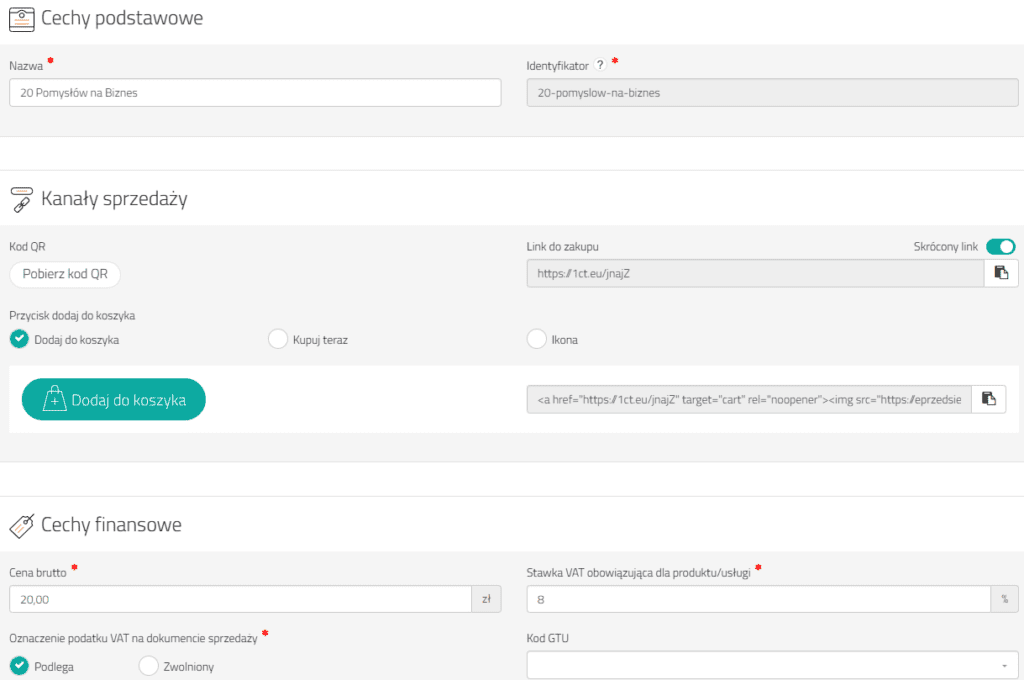 Link generowane w 1koszyk nie są ładne, ponieważ wyglądają mniej więcej tak: „https://1ct.eu/jnajZ”. Link z własną domeną możemy otrzymać dopiero w wersji premium. Dzięki temu może ona wyglądać, np. w ten sposób: „https://eprzedsiebiorca.v.1ct.eu/jnajZ„