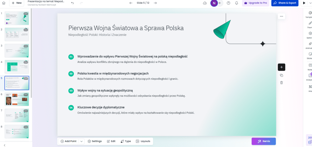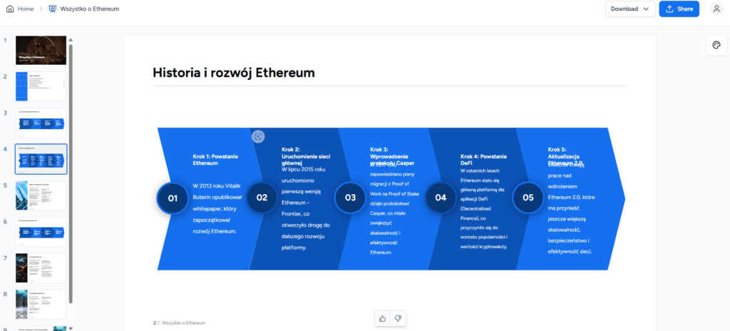 Presentation.ai tworzy wysokiej jakości treści, w których znajdują się elementy wizualne, dane, oraz grafiki. Oferuje dostosowanie długości tekstu od krótkiego do długiego, czego brakuje w innych narzędziach do prezentacji AI. Zapewnia więcej funkcji edycji niż Gamma AI, choć robi więcej błędów merytorycznych, dlatego umieściłem to narzędzie na drugim miejscu.