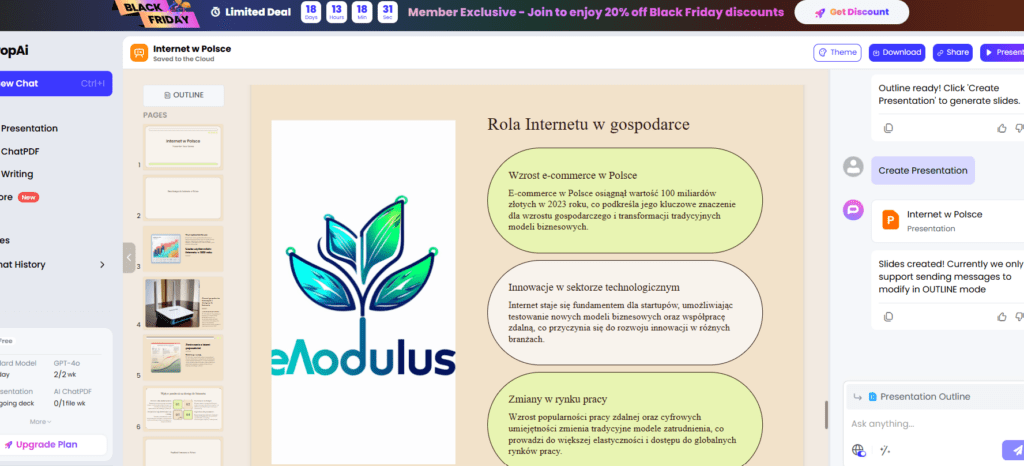 Tworzenie prezentacji jest zdecydowanie wolniejsze, niż u konkurencji, jednak nadal dużo szybsze, niż robienie jej samodzielnie. Jeśli chodzi o jakość, jest dobrze, choć prezentacje wymagają drobnych poprawek pod względem merytoryki. Podoba mi się to, że edytując prezentację, mamy stały dostęp do czatu AI, który może wprowadzać zmiany według naszych upodobań.