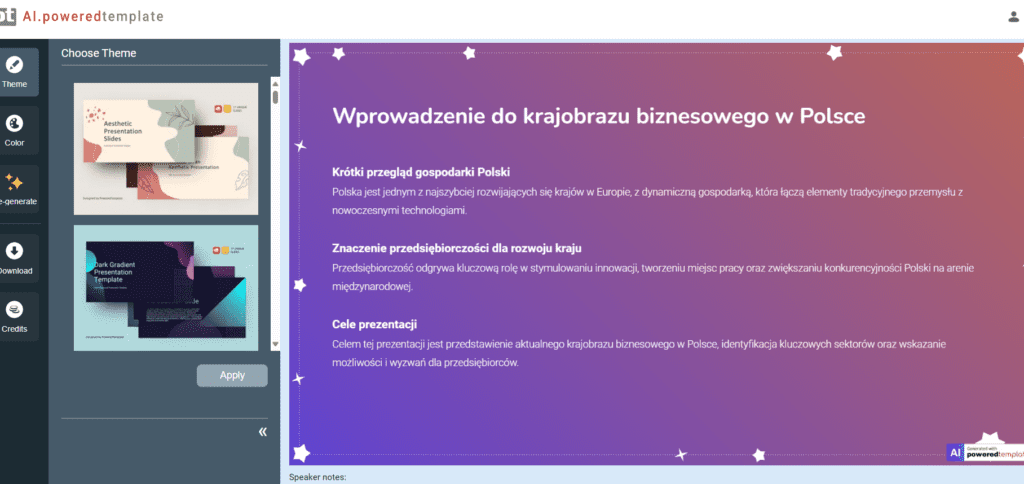 Bardzo fajnym narzędziem jest również AI.poweredtemplate. Będziemy mogli stworzyć w nim prezentacje na każdym temat, a sam proces tworzenia jest analogiczny do konkurencji. Musimy tylko naprowadzić narzędzie o czym ma być prezentacja i wybrać wszelkie szczegóły.