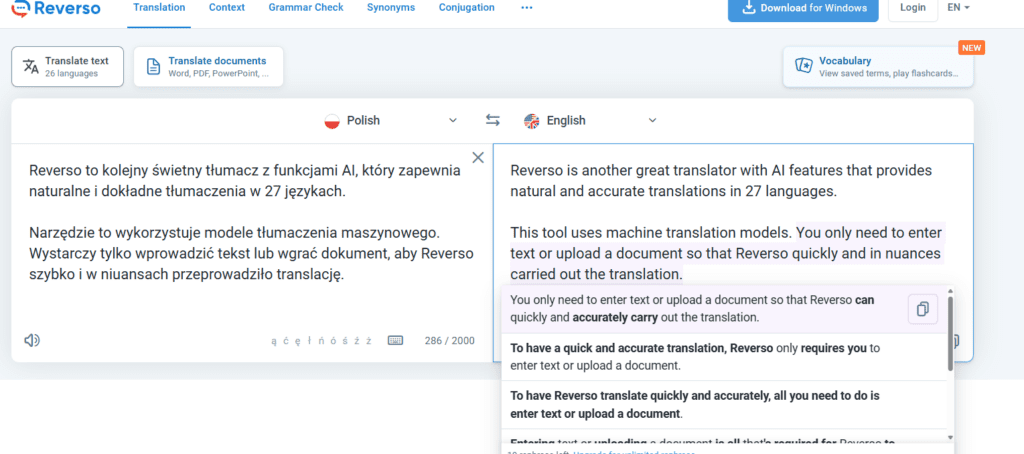 Reverso to kolejny świetny tłumacz z funkcjami AI, który zapewnia naturalne i dokładne tłumaczenia w 27 językach.
