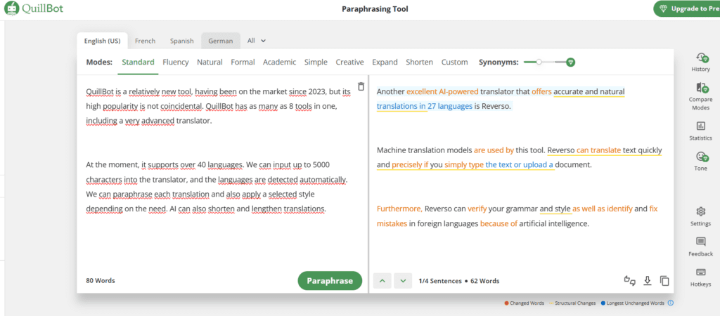QuillBot to stosunkowo nowe narzędzie, bo istnieje na rynku od 2023, jednak jego wysoka popularność nie jest przypadkowa. QuillBot ma aż 8 narzędzi w jednym, w tym bardzo zaawansowany translator.