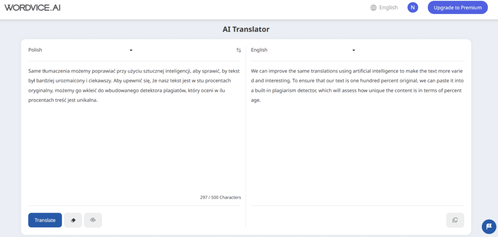 Wordvice to narzędzie AI bardzo przypominające QuillBot. Jest darmowe w użyciu i oferuje tłumaczenia na blisko 50 języków, wraz z wykryciem języka.