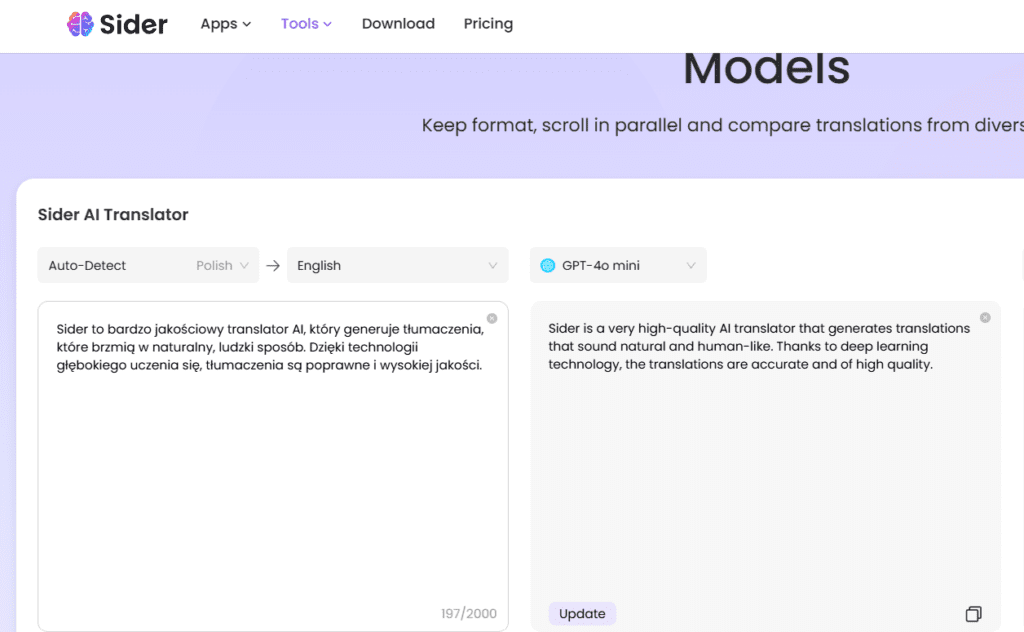 Do wyboru mamy 50 języków obcych. Generowane translacje mogą być dostosowane do stylów, np. profesjonalnie, poetycko, czy zabawnie. Co wyróżnia Sider to możliwość wyboru jednego z 8 modeli językowych, np. GPT-4o mini, czy Claude 3 Haiku. Możemy porównać kilka z nich i wybrać który tekst pasuje nam najbardziej.