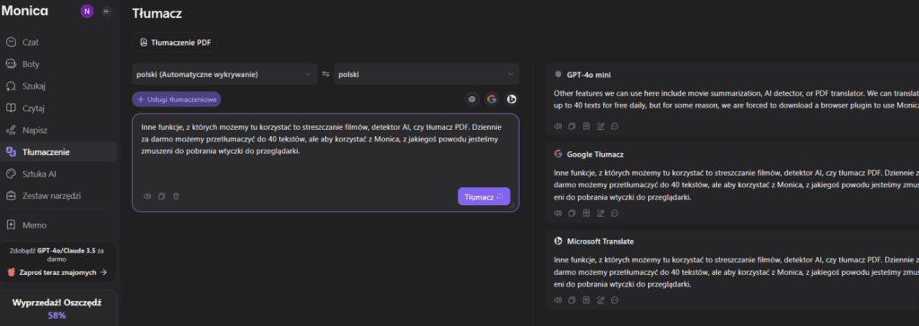 Inne funkcje, z których możemy tu korzystać to streszczanie filmów, detektor AI, czy tłumacz PDF. Dziennie za darmo możemy przetłumaczyć do 40 tekstów, ale aby korzystać z Monica, z jakiegoś powodu jesteśmy zmuszeni do pobrania wtyczki do przeglądarki.