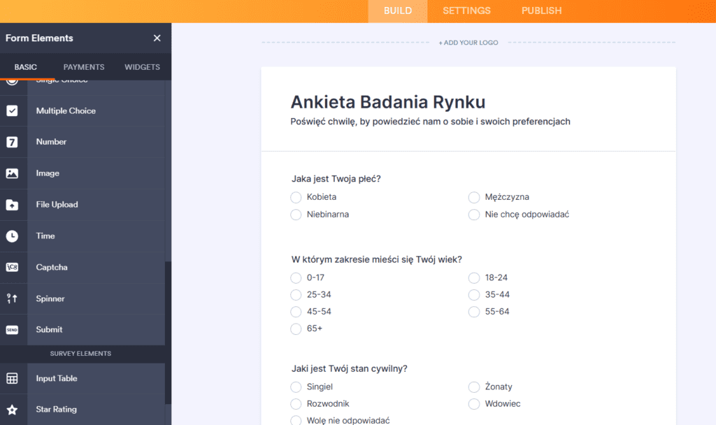 Platforma jest bardzo prosta w obsłudze a tworzenie ankiety sprowadza się do przeciągania i upuszczania elementów. Formularz znajduje się po środku ekranu, pokazując podgląd tego, co zobaczą respondenci. Po rozwinięciu prawego menu możesz dodać więcej elementów do formularza. Otwierając menu po lewej stronie, edytujesz styl formularza.