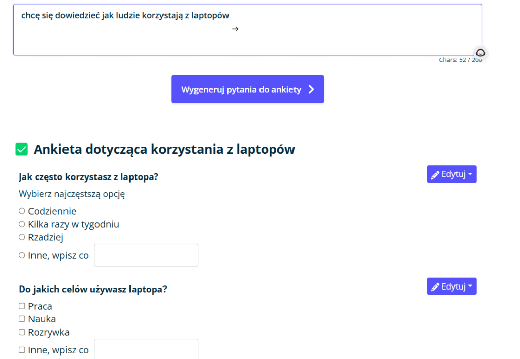 Z pewnością pracę z Webankieta ułatwia około 100 gotowych szablonów do różnych zastosowań, np. szablon badania potrzeb klientów, czy ankiet NPS dla biur podróży. W fazie beta jest też funkcja sztucznej inteligencji, która sama generuje pytania w zależności od wpisanej komendy. Działa ona dobrze i potrafi zaoszczędzić masę czasu, choć warto kontrolować jakość pytań, bo nie wszystkie są użyteczne.