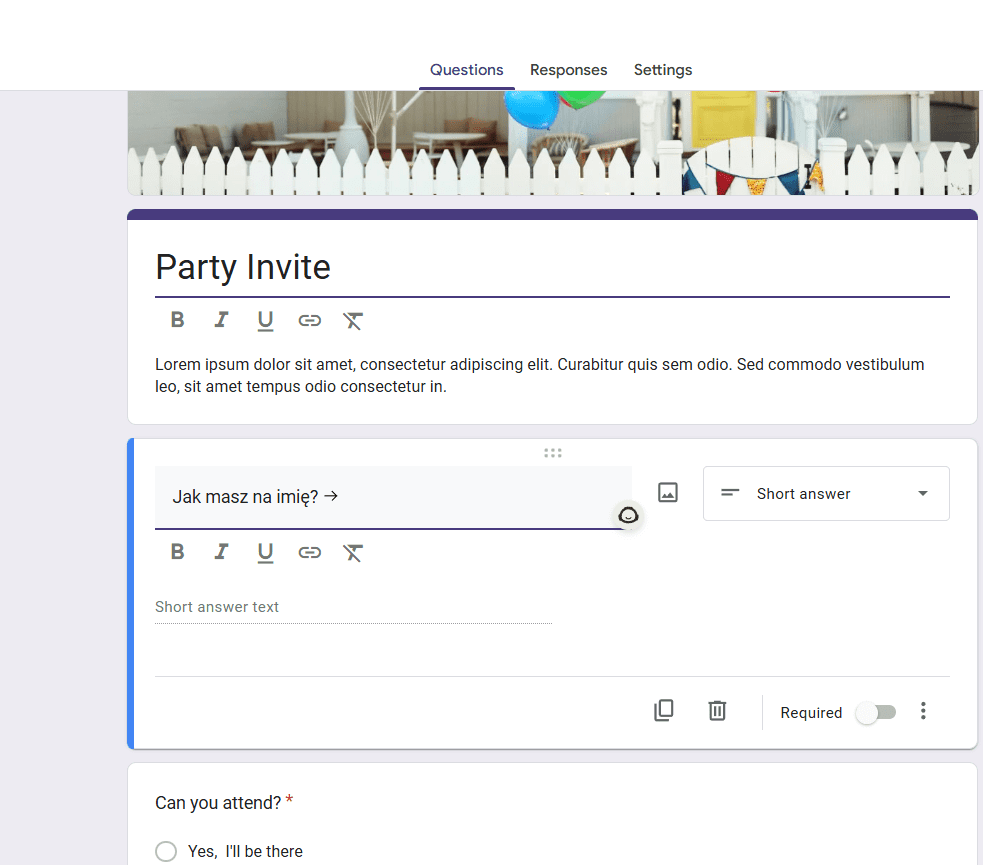 Fajną funkcją, którą warto wymienić jest personalizacja ankiet. Przykładowo, jeśli respondent wpisze swoje imię i nazwisko w jednym pytaniu, możesz zwrócić się do niego po imieniu w kolejnych. Możesz zamieszczać pytania z pojedynczym lub wielokrotnym wyborem, pytania otwarte, skalę od 1 do 10 i inne.