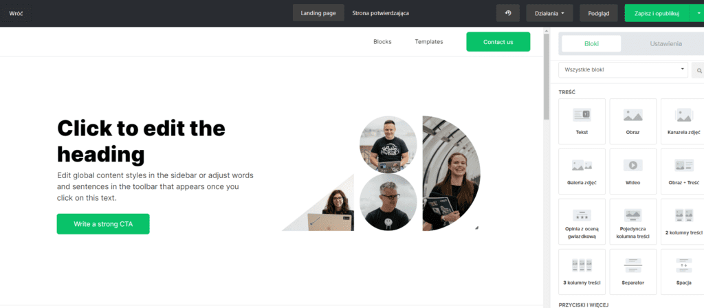 Edytor jest bardzo prosty i jego działanie także opiera się na akcji „przeciągnij i upuść”. Co warte podkreślenia, w darmowej wersji dostępnych jest wiele gotowych szablonów, głównie pod formularze zapisu, choć możemy stworzyć stronę lądującą do dowolnego celu.