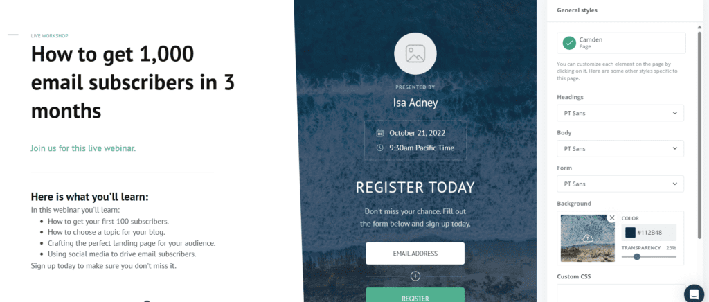 Nie ma tu co prawda zbyt wielu szablonów do wyboru, choć są one dość ładne graficznie. Nie możesz również dostosować strony z podziękowaniami/potwierdzeniem, a opcji edycji ustawień formularza jest mniej niż w przypadku MailerLite.