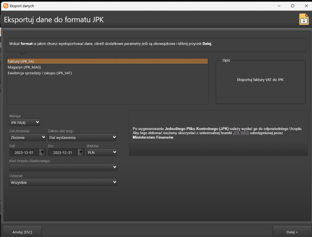 W abcFaktury możemy również generować pliki kontrolne JPK, takie jak JPK-V7M, JPK-V7K, JPK-FA i JPK-MAG za dowolnie wybrany przez nas okres.