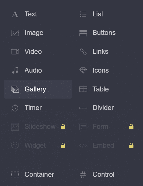 Jeżeli chodzi o elementy, jakie możemy nanieść na stronę, to są to między innymi obrazki, wideo, galerie, minutniki, rozdzielacze, czy przyciski. Niektóre z elementów, na przykład formularze nie są dostępne za darmo i odblokujemy je w wersji płatnej.