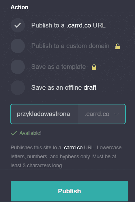 Przechodząc dalej, darmowy plan pozwala ustalić własną domenę z subdomeną Carrd.co. Przykładowo, nasza strona może nazywać się przykladowastrona.carrd.co. Jak na darmowy plan to jest to i tak niezłe rozwiązanie, ponieważ wiele tego typu platform wybiera nazwę strony za nas i zwykle nie będzie ona zbyt ładna. Przykładowo, w edytorze o nazwie SITE123 naszą domeną będzie mniej więcej coś w stylu: 434783475934hehfdh4.site.me. Dodatkowym plusem jest to, że nasza stroną z subdomeną .carrd.co będzie objęta szyfrowaniem SSL i posiadała zieloną kłódkę.