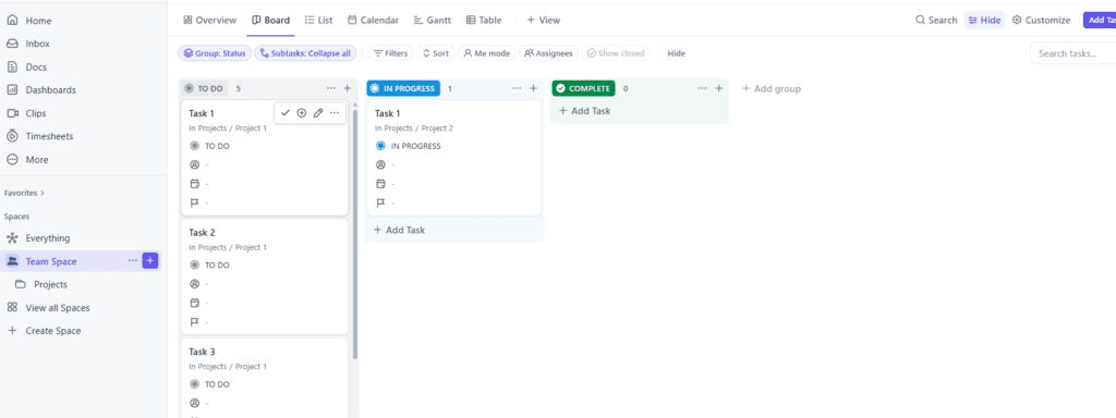 Zarządzanie zadaniami to kluczowa funkcja tego typu platform, a w ClickUp zadbano o to, by była ona zaprojektowana tak dobrze, jak to tylko możliwe. ClickUp zapewnia wiele informacji, do których możesz uzyskać dostęp na karcie zadań, oraz wiele sposobów ich przeglądania.