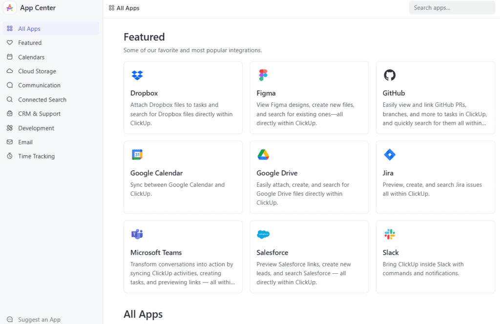 ClickUp posiada około 50 integracji dostępnych w App Center.