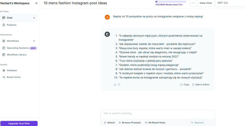 Najważniejszą funkcję Copy.ai jest zakładka „Czat”, w której mamy do dyspozycji okno czatu podobne do tego z ChatGPT. Jest ono jednak bardziej wzbogacone o funkcje.