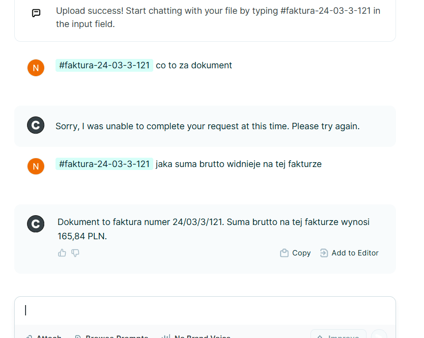 Copy.ai idzie jednak o krok dalej i oferuje kilka usprawnień do czatu. Przykładowo, do czatu możemy dołączyć plik oraz pracować z nim. Na potrzeby artykułu, dołączyłem fakturę VAT. Copy.ai co prawda nie potrafił stwierdzić jaki to rodzaj dokumentu, ale gdy zapytałem jaka na fakturze widnieje kwota, poradził sobie doskonale.