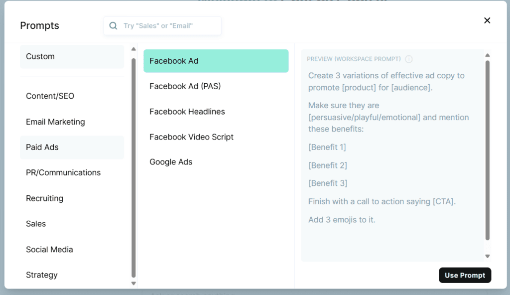 Przykładowo, aby stworzyć tekst do reklamy na Facebooku napisałbym mniej więcej coś takiego „Stwórz mi tekst do reklamy na Facebooku mojego kursu, tekst ma być przekonujący do zakupu”. Gotowe komendy Copy.ai są bardziej zaawansowane i skuteczne, ze skupieniem na grupę docelową, benefity, czy wezwanie do działania.