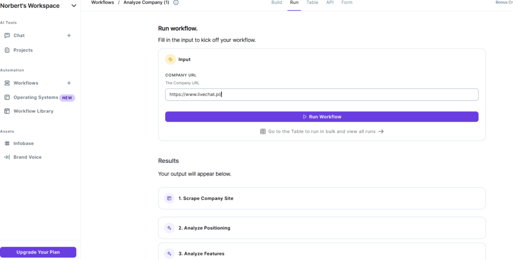 Mamy różne szablony przepływów zadań. Dla przykładu wybrałem szablon analizy danej firmy. Wystarczyło tylko wkleić URL danej firmy a Copy.ai wykona za nas analizę.