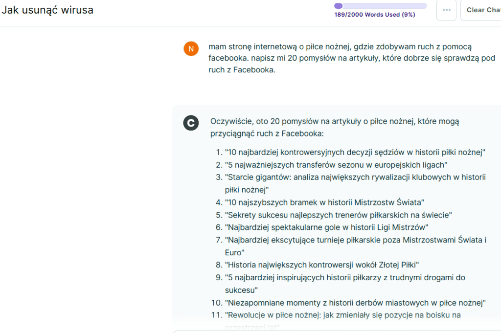 Aby przetestować jakość generowanych tekstów, napisałem przykładową komendę i poprosiłem o stworzenie 20 pomysłów na artykuły na Facebooka. Odpowiedź była dość satysfakcjonująca a pomysły ciekawe. Copy.ai z pewnością wziął pod uwagę to, że pomysły na artykuły dla Facebooka powinny być nieco inne, niż pod SEO i właśnie takie mi zaproponował.