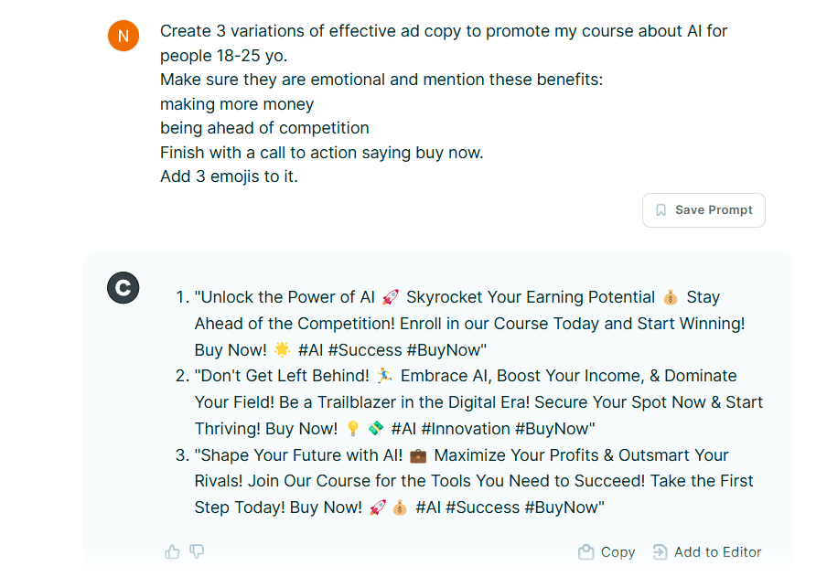 Aby uzyskać najlepsze wyniki, zleć Copy.ai drobne zadania, takie jak tworzenie opisów produktów lub nakreślanie struktury postów na blogu. Zawsze możesz dostosować odpowiedź, aby jeszcze bardziej ulepszyć wyniki lub dodać konkretną wiedzę.