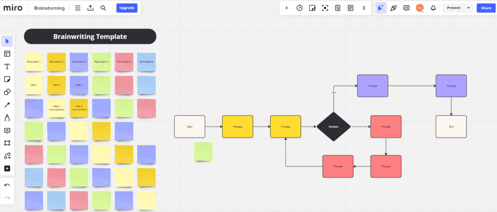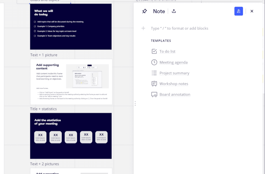 Miro oferuje tablice cyfrowe, na których możesz wizualnie przedstawiać swoje projekty i pomysły. Tablice te obsługują różne elementy, takie jak udostępnianie ekranu, wirtualne karteczki samoprzylepne, których można używać do zapisywania szybkich notatek, oraz narzędzia do rysowania, które umożliwiają odręczne szkicowanie lub tworzenie diagramów.