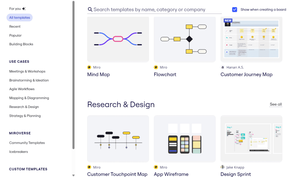 Tworzenie map myśli czy schematów od zera może być czasochłonne. Aby rozwiązać ten problem, Miro oferuje szeroki wybór gotowych szablonów do różnych celów.