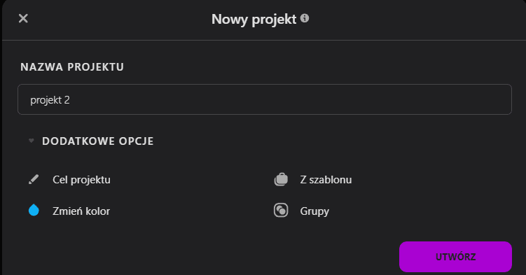 Każdy projekt możemy nazwać, dodać do niego cele, oraz zmienić kolor, który będzie służył jako odróżnienie na liście projektów. Dodatkowo, możemy tworzyć gotowe szablony projektów, jeśli nasze prace są powtarzalne. W płatnej wersji istnieje możliwość wyboru grupy pracowników, by przypisać ich do wykonywanego projektu.