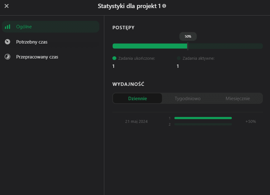 Co równie istotne, przy każdym projekcie możemy podglądać jego statystyki, takie jak postępy, wydajność, czy czas spędzony na nim. Będzie to na pewno przydatne do obserwacji produktywności oraz rozliczeń.