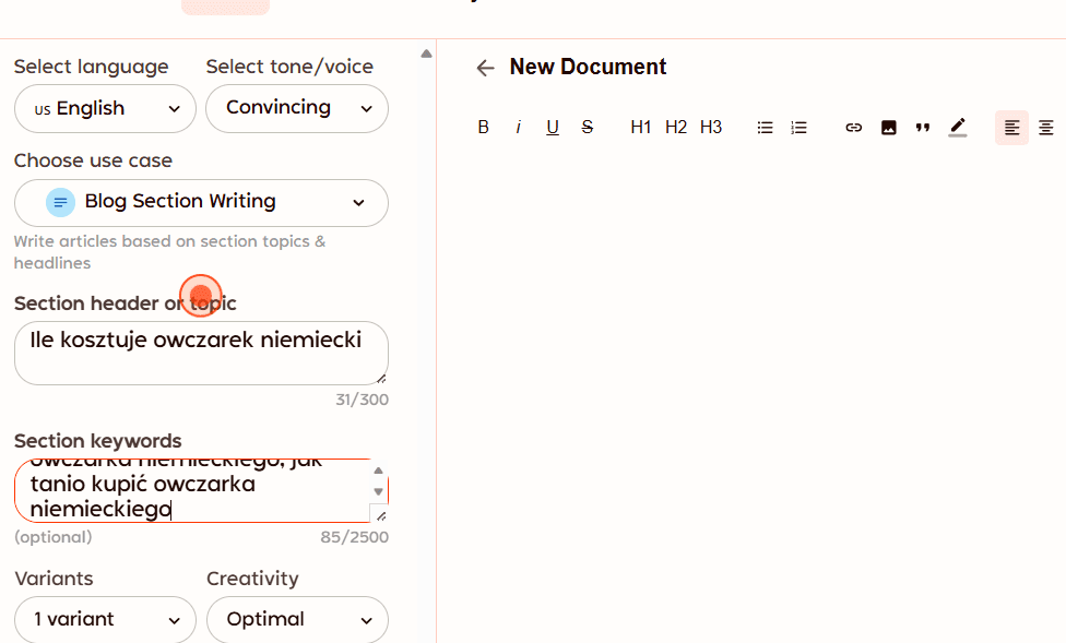W zależności od wybranego przypadku użycia, musimy wpisać komendę, słowa kluczowe, opisać naszą firmę, itd. Na koniec wybieramy ile wersji tekstu Rytr ma nam wygenerować (1-3 wersje), oraz wybieramy poziom kreatywności.