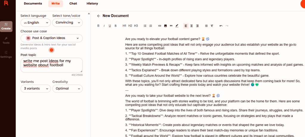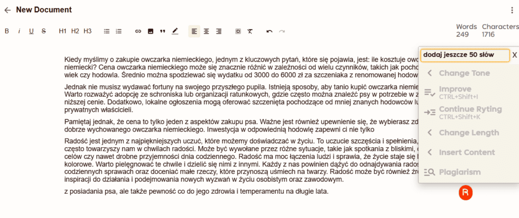 Rytr utworzy treść w ciągu kilku sekund. Po jej wygenerowaniu, możemy ją edytować, np. dodając komendę słowną, zmienić ton, poprawić tekst, oraz edytować wizualnie dokument tak jak w przypadku edytorów typu Word.