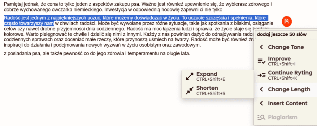 Generowane treści możemy praktycznie dowolnie edytować. Wśród opcji edycji są między innymi poprawianie błędów, przeformułowywanie, rozszerzanie fragmentów, oraz sprawdzanie plagiatu.