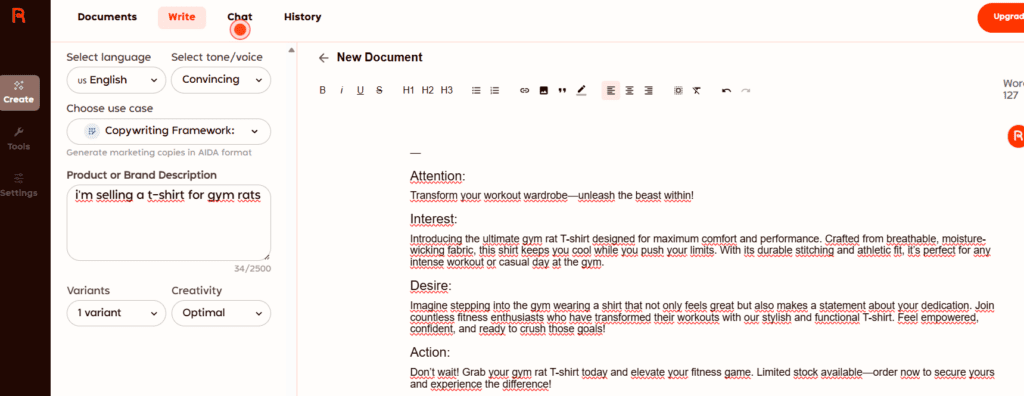 Treści marketingowe: Jeżeli nie masz doświadczenia w marketingu, Rytr pomoże ci stworzyć treści marketingowe, np. zgodnie z modelem AIDA, abyś mógł sprzedawać więcej. Choć jakość tych treści jest dobra, to wiele wariantów nie oznacza więcej pomysłów.