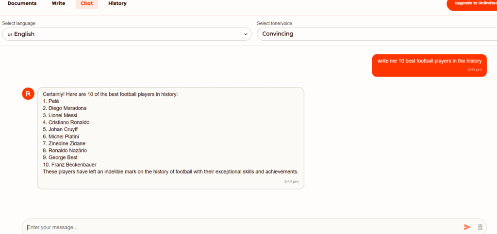 Rytr posiada również zakładkę z czatem, którą możesz skojarzyć z Chat GPT, wszak korzysta ona z tej samej technologii, choć nie najnowszej, bo z GPT-3, a nie GPT-4. Sam czat jest bardzo zbliżony działaniem do Chat GPT. Po prostu wpisujesz pytanie i po kilku sekundach otrzymujesz odpowiedź.
