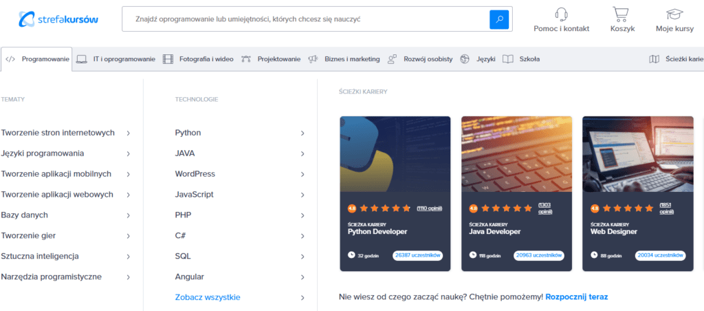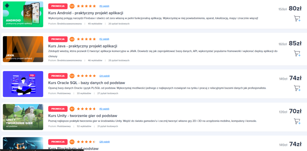 Porównując to z konkurencją typu Udemy czy Coursera, ceny są bardzo zbliżone. W Udemy, o którym możesz przeczytać tutaj znalazłem wiele darmowych kursów, co również mogłoby być fajną zachętą w Strefie Kursów, jednak czegoś takiego tu nie ma.