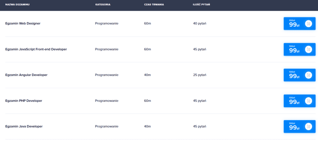 Jeżeli chcesz uzyskać certyfikat specjalisty bez przechodzenia kursu, również możesz to zrobić. Wówczas musisz jednak wykupić egzamin w cenie 99 zł, jeśli jest promocja lub 199 zł w cenie regularnej. Do egzaminu możesz podchodzić dowolną liczbę razy i zostaje on zaliczony, gdy uzyskasz minimum 80%.