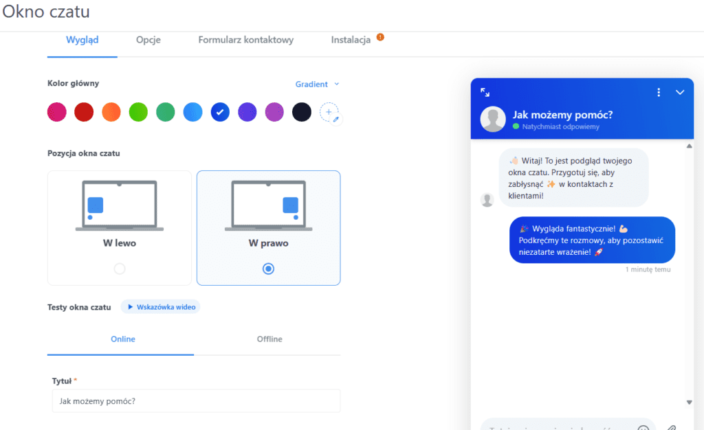 Jest on wysoce konfigurowalny i możemy ustawiać wiele rzeczy. Możemy między innymi ustawić kolor, by pasował do naszej marki, pozycję okna czatu, tytuł, wygląd ikony, czy język.