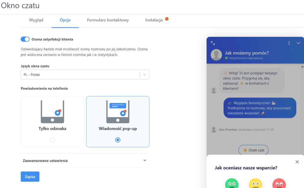 Po zakończeniu czatu opcjonalnie możesz ustawić możliwość oceny rozmowy. Dzięki temu możesz uzyskać informacje co powinieneś poprawić w kolejnych konwersacjach, by doświadczenie użytkownika było lepsze.
