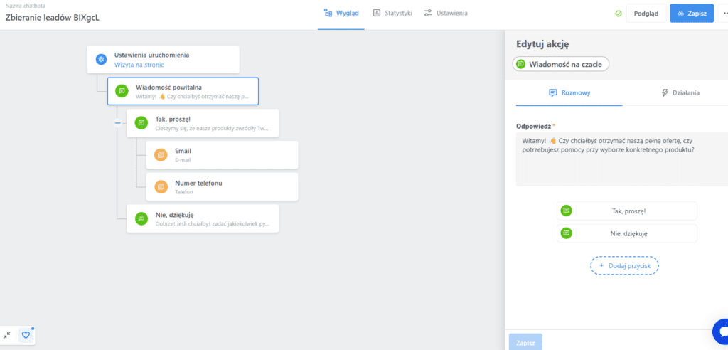 Najlepiej korzystać z gotowych szablonów, ponieważ jest z nimi mniej pracy i są one dostosowane do najpopularniejszych przypadków. Mogą być to np. automatyczne rozmowy związane z często zadawanymi pytaniami, zbieranie e-maili, czy oferowanie zniżek.