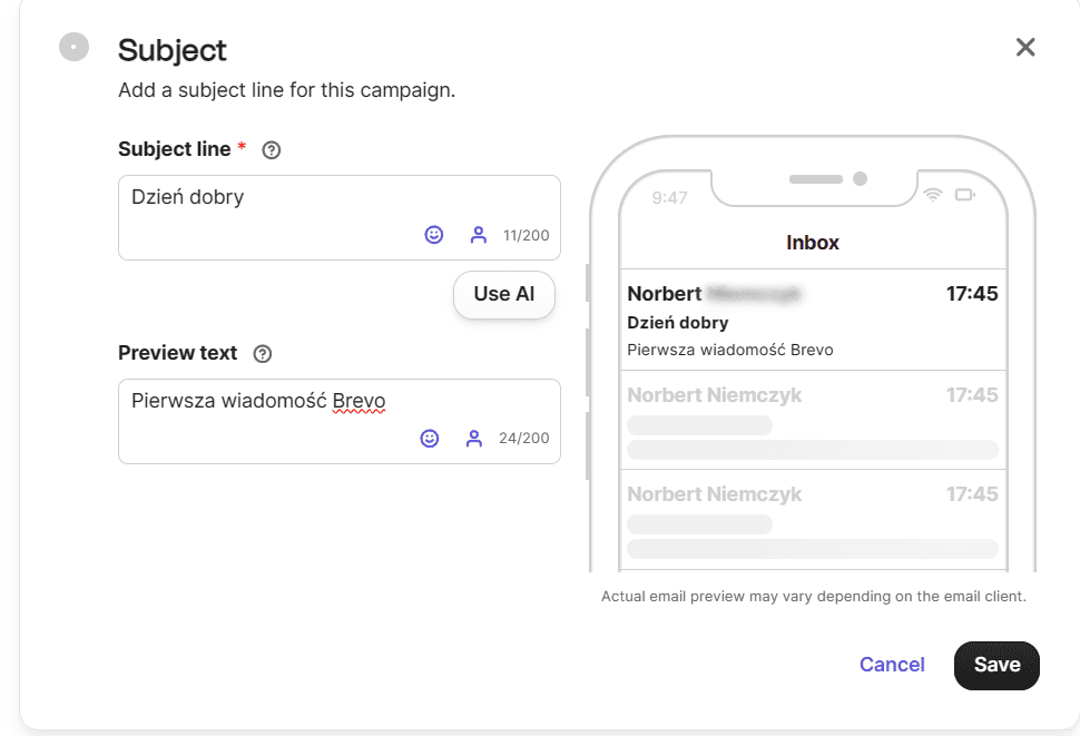 Pierwszą funkcję jest tworzenie kampanii e-mail. Zanim przejdziemy do edytora wiadomości, na początku musimy wybrać grupę odbiorców wiadomości. W kolejnym kroku ustawiamy tytuł i treść podglądową wiadomości e-mail. Fajną opcją jest to, że mamy podgląd live jak wiadomość będzie prezentowała się w skrzynce odbiorcy.