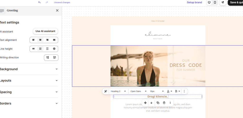 Edytor w Brevo jest wygodny, lecz raczej nie oferuje nic więcej od edytorów w podobnych narzędziach typu GetResponse, czy Mailchimp.