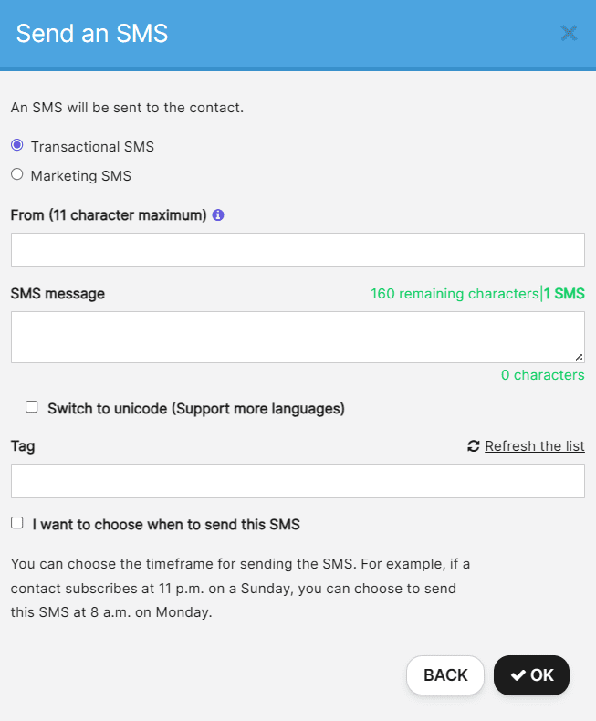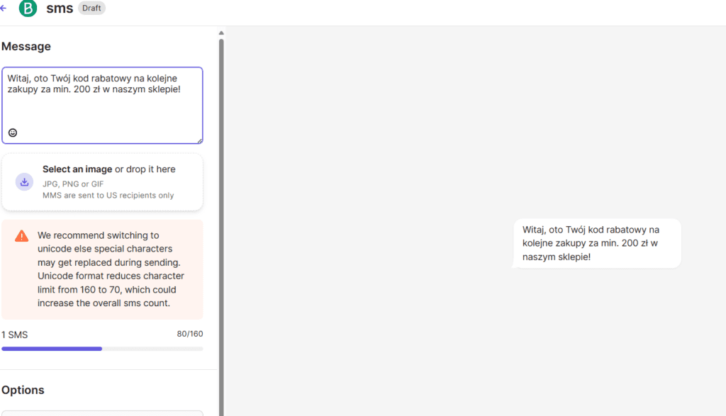 Funkcją, która wyróżnia Brevo jest możliwość wysyłania kampanii SMS. Cały proces jest także dziecinnie prosty. Wystarczy tylko wybrać odbiorców, wybrać nadawcę, oraz wpisać treść wiadomości.