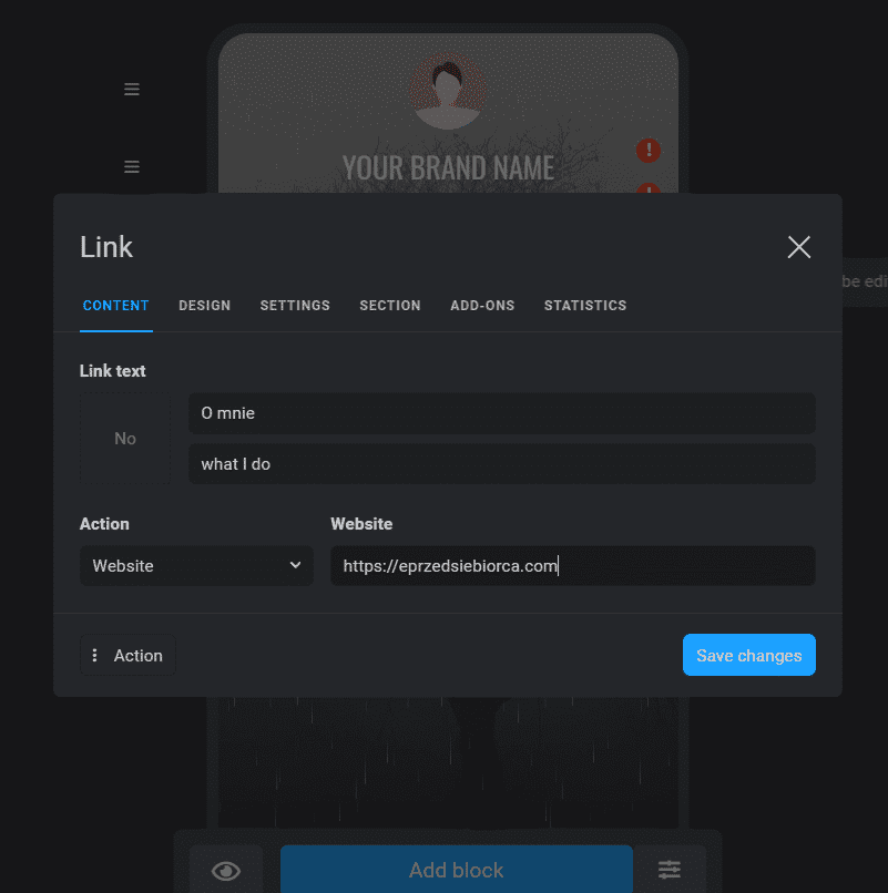 Business: Za 6 euro miesięcznie, mamy dostęp do wszystkich bloków, usunięte znaki wodne Taplink, możliwość ustawienia własnej domeny w linku wraz z certyfikatem SSL.