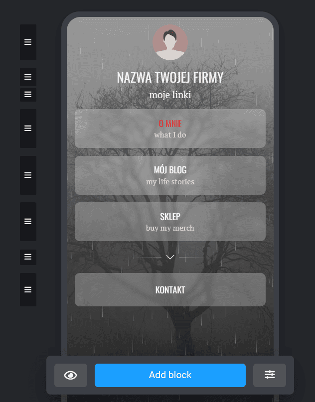 Z Taplink możemy stworzyć responsywną stronę, która zawiera wiele przydatnych elementów, takich jak wideo, przyciski z linkami, zdjęcia, cenniki, obrazki, czy formularze.