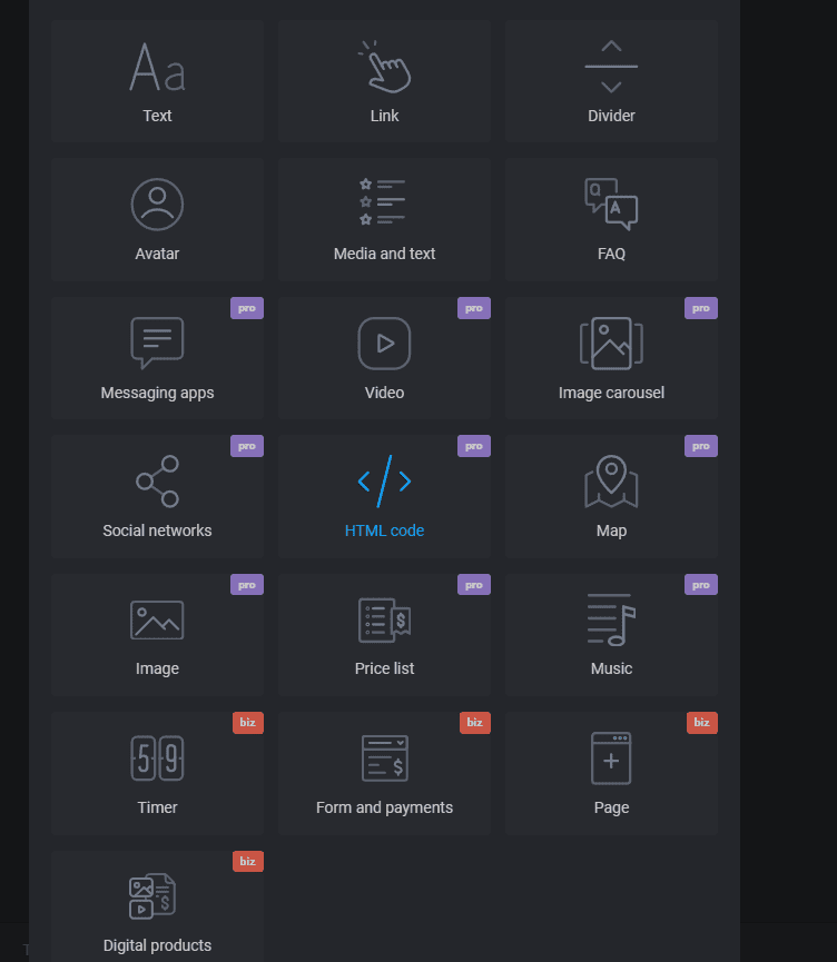 Jeżeli chodzi o wybór rodzajów bloków na stronę, to jest ich kilkanaście. Niektóre są dostępne w wersji darmowej, np. tekst, link, czy awatar. Do innych uzyskamy dostęp dopiero w wersji płatnej i są to przykładowo cenniki, obrazki, mapy, czy karuzela z obrazkami.