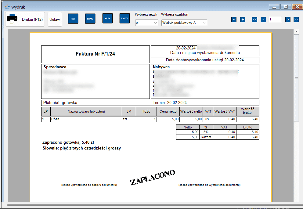 Faktura gotowa do druku prezentuje się tak jak poniżej. Niestety nie znalazłem w programie opcji dostosowywania wyglądu, takich jak możliwość dodania logo, czy zmianę kolorystyki. Możemy zmienić jedynie szablon, ale będą to kosmetyczne zmiany.